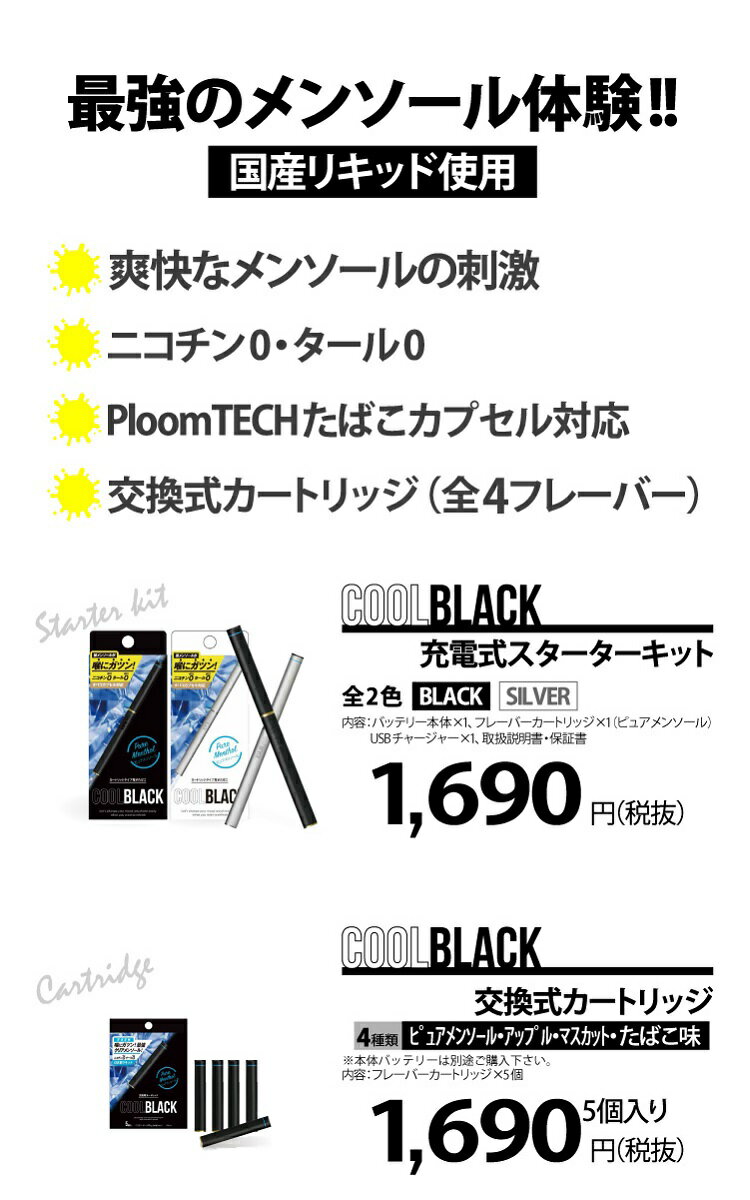 ■本体サイズ 本体全長 : 約9.2×140mm バッテリー : 約9.2×83mm カートリッジ : 約9.2×60mm ■内容量 320mAh ■重さ 17g ■電圧/電流 5V / 120mA ■特徴 連続喫煙可能 (パフ回数 : 400回前後@満充電) 短時間充電 : 約90〜120分 繰り返し充電 : 300回 喉にガツン!とくる爽快な刺激がたまらない! タバコと同様な満足感を得られます(※ニコチン・タールは一切含みません) 選べるボディカラー2色×フレーバー4種類から、お好みの1本を! ※スターターキットはピュアメンソールのみ 父の日 プレゼント お祝い 御礼 お礼 お返し 贈り物 贈答品 お手軽 KAMIKAZE 電子たばこ 禁煙 喫煙 節煙 連続で吸える 充電 お洒落 オシャレ 黒 銀 カミカゼ ブラック シルバー 交換 互換 スティック型 タバコ型 煙草型 たばこ型 細長い 軽い 軽量 うまい キック 掃除 簡単 操作 電子煙草 電子 早い 男性 女性 男女 兼用 男女兼用 大人 バッテリー フル充電 プルーム テック PloomTECH JT 母の日 におい 臭い 気にならない 日本たばこ たばこカプセル レディース メンズ つかない おすすめ 充電時間 短い すぐ吸える オススメ メンソール 保証 menthol 電池残量 小さい 加熱時間<対応カートリッジ(※別売)> カートリッジはコチラ >